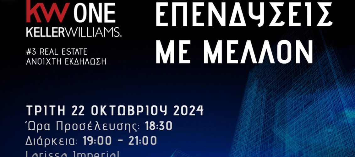 Μία νέα ανοιχτή εκδήλωση από την εταιρεία Keller Williams One για την αγορά ακινήτων θα πραγματοποιηθεί την Τρίτη 22 Οκτωβρίου 2024 στην Λάρισα. Η εκδήλωση αφορά το Real Estate και τις επενδύσεις που αναδεικνύονται ως πυξίδα ανάπτυξης και μακροπρόθεσμης δημιουργίας αξίας. Μέσα από τις συζητήσεις του πάνελ και τις τοποθετήσεις των ομιλητών της εκδήλωσης, οι παρευρισκόμενοι θα έχουν την ευκαιρία να ενημερωθούν για τις νέες προοπτικές και ευκαιρίες της αγοράς ακινήτων που διαμορφώνουν ένα βιώσιμο μέλλον.