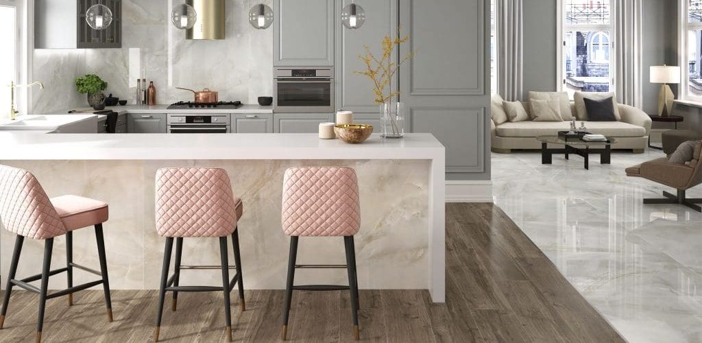Πλακάκια πορσελάνης με υφή τσιμέντου σε ενιαίο χώρο σαλονιού – κουζίνας