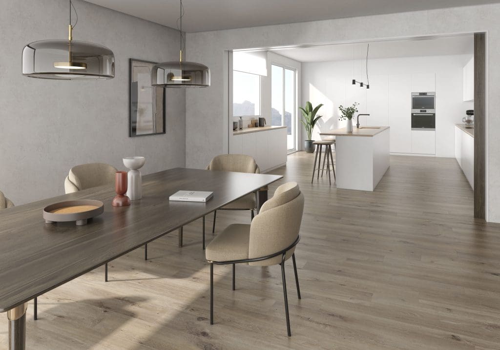 Εάν προτιμάτε μια απλή και σίγουρη λύση, σας προτείνουμε να χρησιμοποιήσετε τα ίδια πλακάκια δαπέδου για το σαλόνι και την τραπεζαρία. Αυτό δημιουργεί μια πιο ευρύχωρη αίσθηση, μειώνοντας τις τυχόν δυσκολίες και βοηθώντας στην ομαλή ενσωμάτωση των υλικών στο χώρο. Επιπλέον, χρησιμοποιώντας το ίδιο μοντέλο πλακιδίων δαπέδου και στους δύο χώρους, είναι πολύ πιο εύκολο να επιλέξετε τα έπιπλα, τα χρώματα και τη διαρρύθμιση του χώρου. Σημαντικό είναι να επιμείνετε σε ένα στυλ που συνάδει με το υπόλοιπο σπίτι.