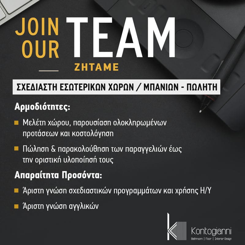 Αναζητούμε Σχεδιαστή Εσωτερικών Χώρων/Μπάνιων-Πωλητή για να ενταχθεί στην ομάδα μας!