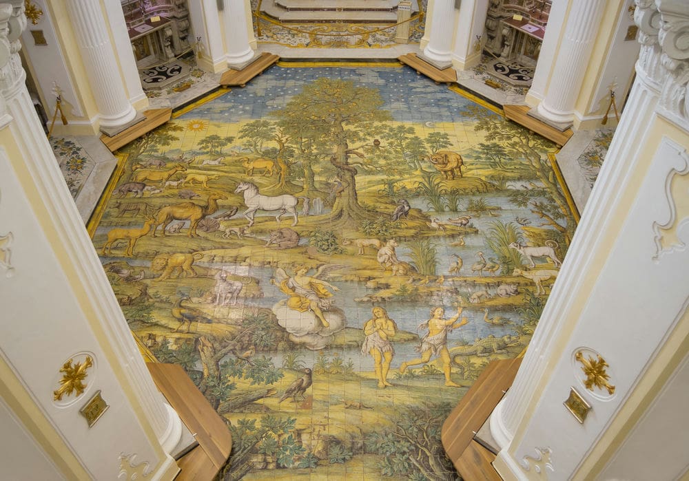 Δημιουργημένο με πλακάκια από τον καλλιτέχνη Lonardo Chianese μετά από σχέδιο του ζωγράφου Francesco Solimena, αυτό το μωσαϊκό δάπεδο αντιπροσωπεύει την ιστορία του Αδάμ και της Εύας στον Κήπο της Εδέμ. Θεωρείται ένα από τα ωραιότερα δείγματα τέχνης με πλακάκια, και για αυτόν τον λόγο οι επισκέπτες δεν επιτρέπεται να περπατήσουν πάνω του. Οι πεζογέφυρες βρίσκονται γύρω από τον όροφο.
