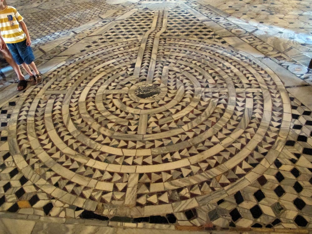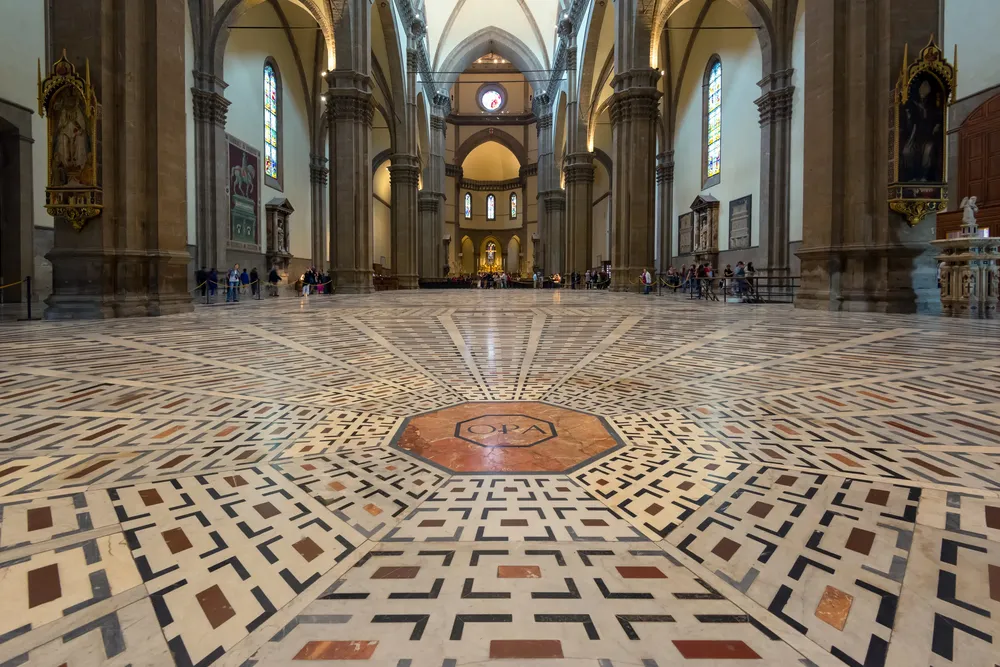 Χρειάστηκαν 150 χρόνια, πολλοί μαρμάρινοι ογκόλιθοι και πολλοί εξειδικευμένοι τεχνίτες για να δημιουργήσουν το πανέμορφο πολύχρωμο πάτωμα της Santa Maria del Fiore της Φλωρεντίας. Προσανατολισμένο γύρω από ένα κεντρικό οκταγωνικό σχήμα, το δάπεδο σχεδιάστηκε από τον Φλωρεντίνο δάσκαλο Simone del Pollaiolo και είναι ένα αριστούργημα γεωμετρικής συμμετρίας και μαρμάρου.